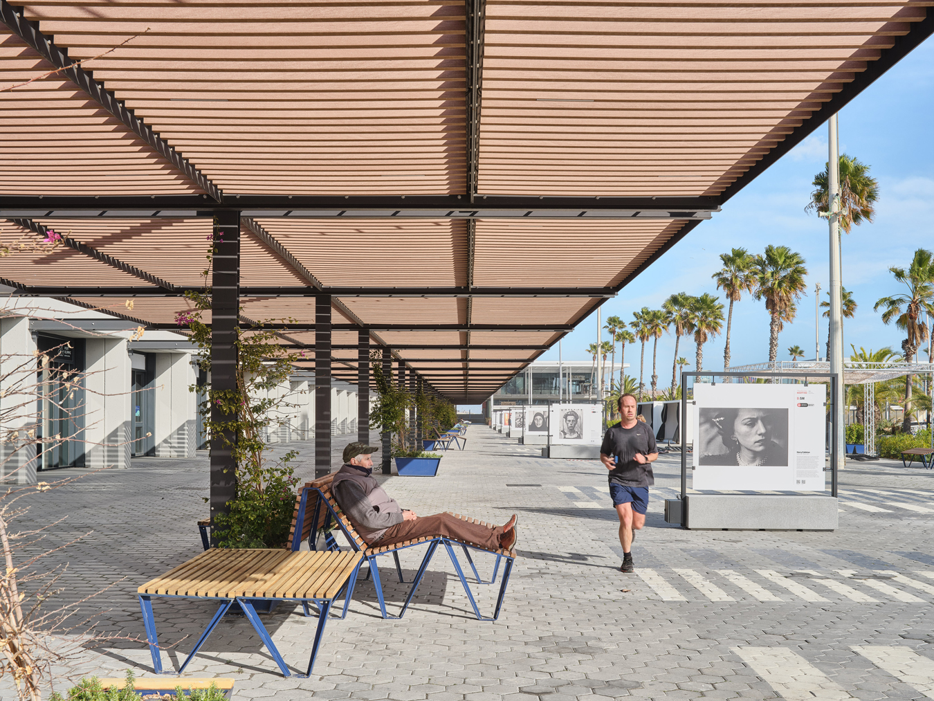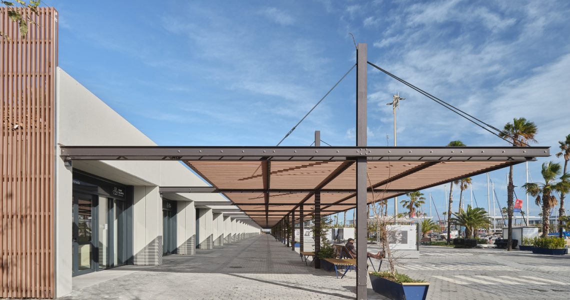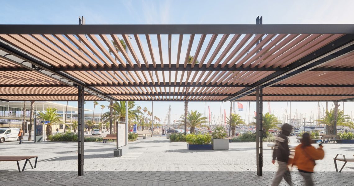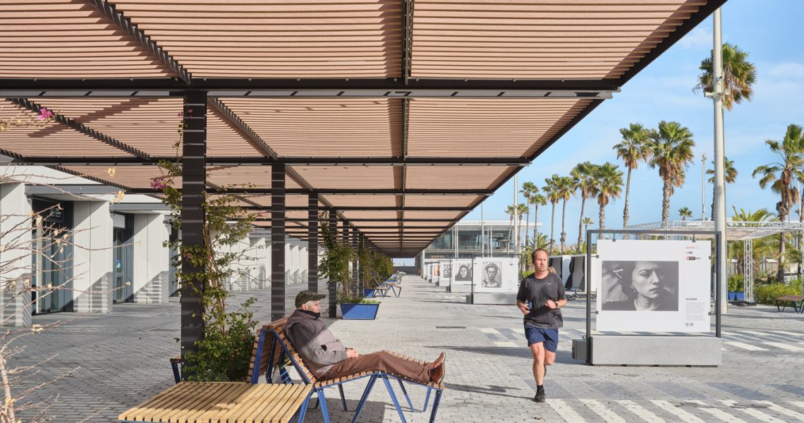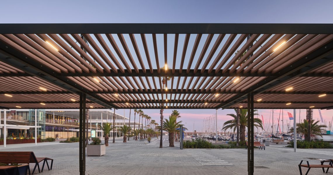 A més, s’ha construït una nova pèrgola d’estrcutura metàl·lica, amb lames d’encenalls de fusta de pi reciclats amb certificat PEFC i amb il·luminació LED integrada, que potencia l’espai immediatament inferior i adjacent, transformant-lo en una àrea pública d’alta qualitat, equipada amb zones d’ombra, mobiliari urbà i vegetació. Es fomenta la convivència, l’oci i el descans, permetent múltiples usos: passeig, estada, activitats, esport, exposicions…