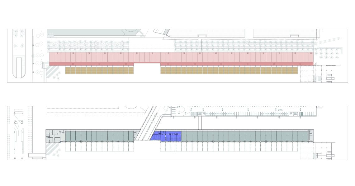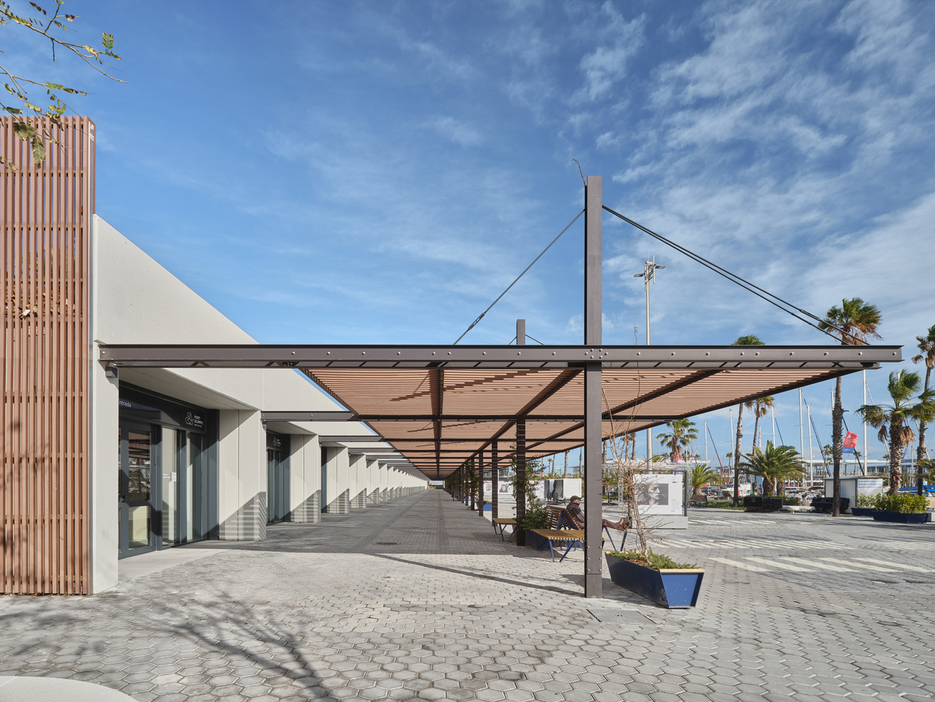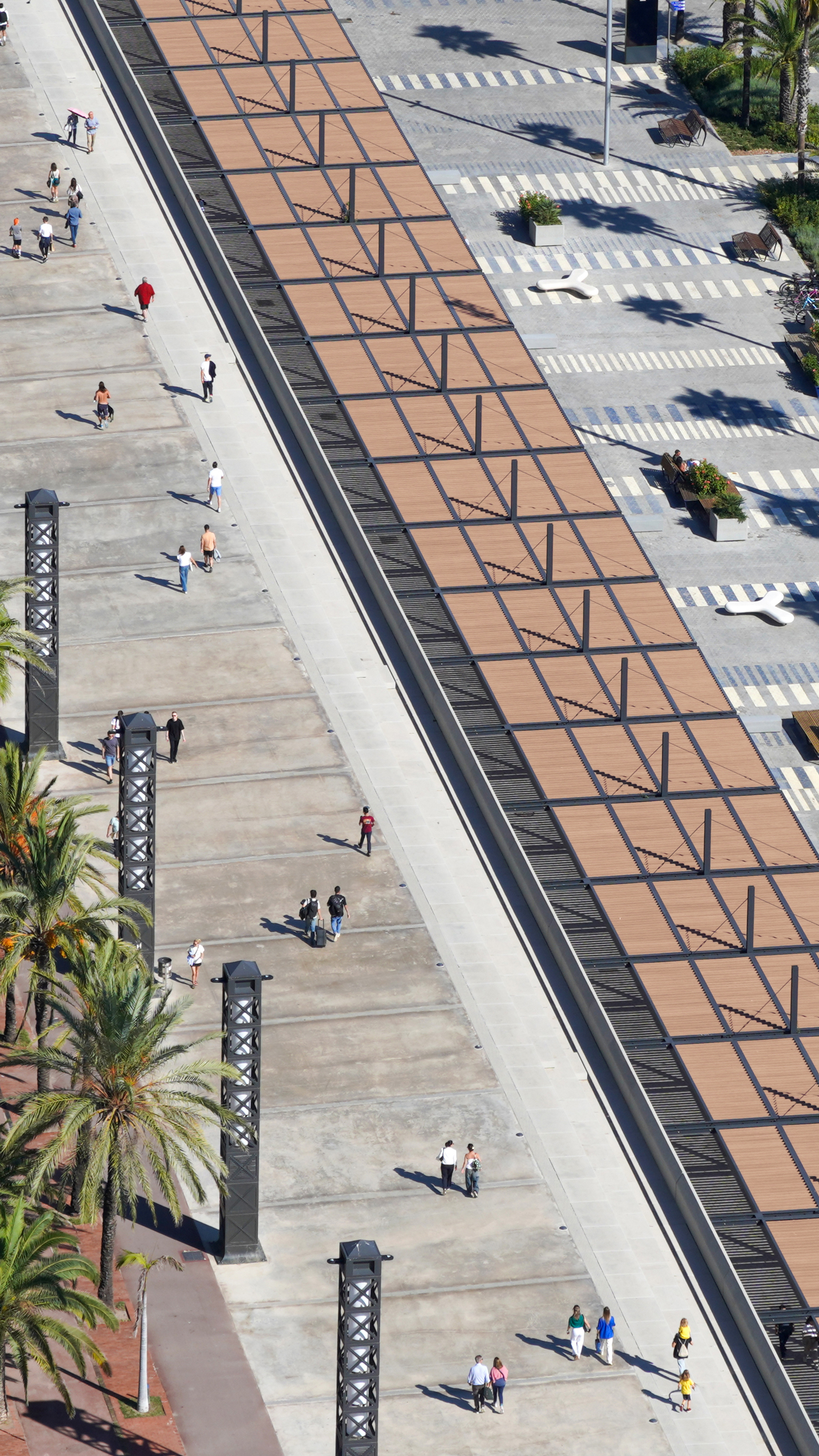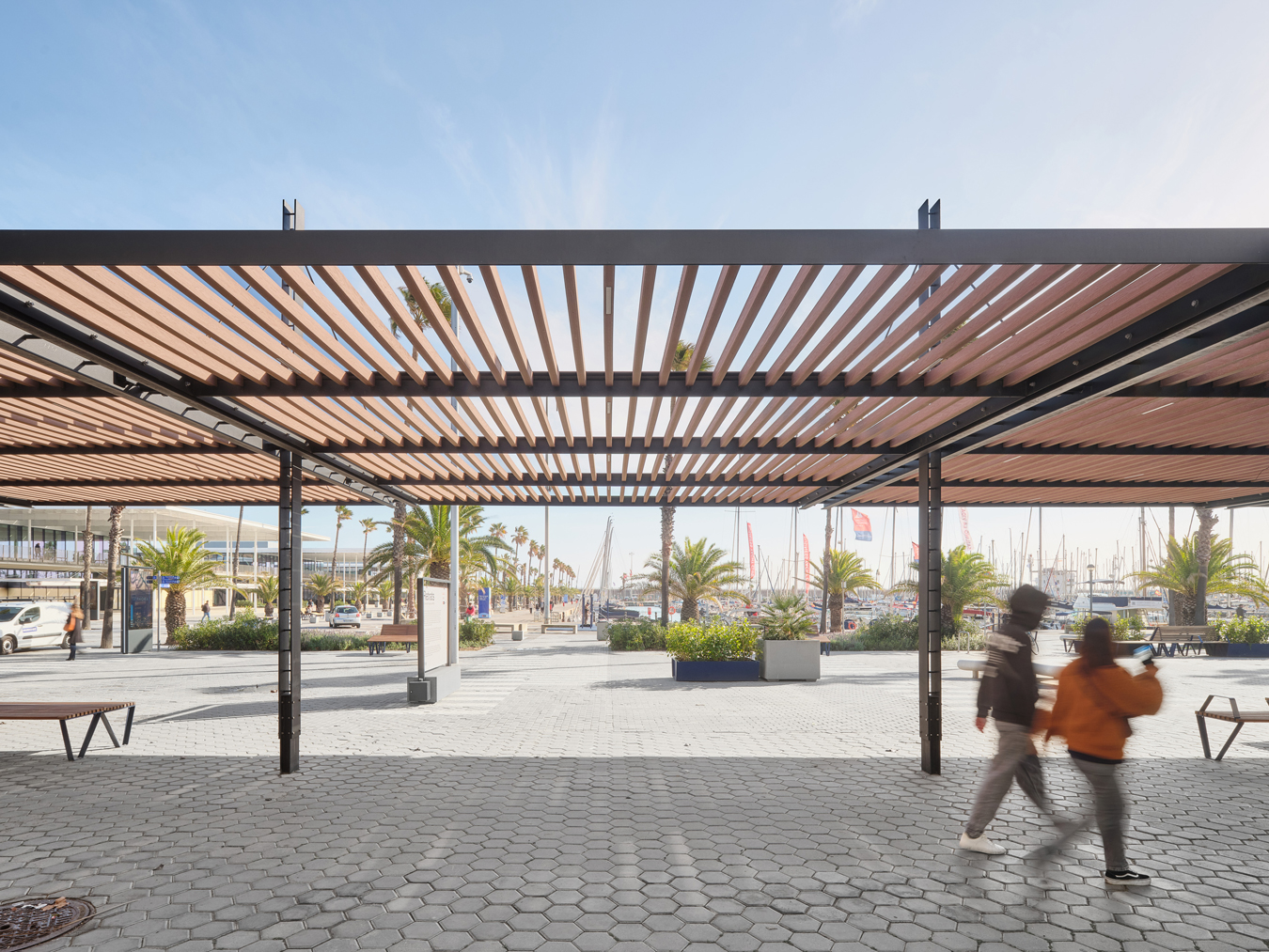 A més, s’ha construït una nova pèrgola d’estrcutura metàl·lica, amb lames d’encenalls de fusta de pi reciclats amb certificat PEFC i amb il·luminació LED integrada, que potencia l’espai immediatament inferior i adjacent, transformant-lo en una àrea pública d’alta qualitat, equipada amb zones d’ombra, mobiliari urbà i vegetació. Es fomenta la convivència, l’oci i el descans, permetent múltiples usos: passeig, estada, activitats, esport, exposicions…